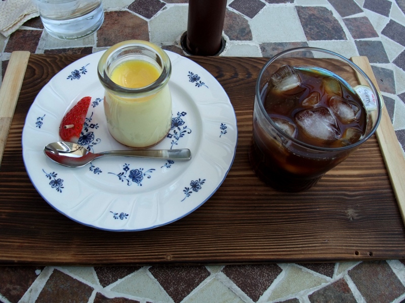 お店の中も素敵な雰囲気ですが、天気もいいので外のテラスで頂くことにしましょう。ここまで走ってきて火照った体をお冷で冷ましながらプリンを待ちます。しばらくして笑顔の素敵なお姉さん(たぶん女主人)がコーヒーとプリンをテラスのテーブルまで運んできてくれました。濃厚な卵の味のするプリンで美味しくいただきます。シフォンケーキも頼めばよかったか…いや、また来たときに取っておきましょう。
