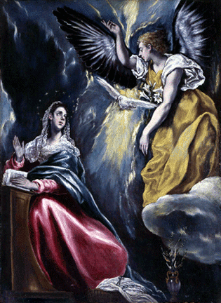 エル・グレコ(1541-1614)は、ギリシアのクレタ島の出身。本 名は、ドメニコス・テオトコプーロス。 エル・グレコとは、古い スペイン語で「ギリシア人」を意味します。ヴェネツィアやロー マで修行を積んだ後、スペインに移り活躍しました。 「受胎告知」には、聖母マリアが、天使ガブリエルからキリスト の受胎を告げられる場面が描かれています。天使が左手に持つの は、マリアの純潔を象徴する白百合の花。 中央に舞い降りている のは、聖霊の象徴の鳩です。