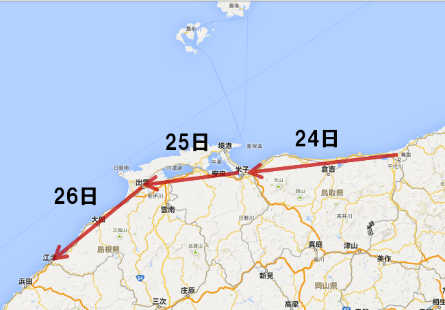 宿の主人に連泊のお願いをし、明日は荷物を置いて身軽な状態で境港、松江。あわよくば出雲大社まで走って米子に戻ってくるルートにしましょう。輪行も米子駅から伯備線で倉敷に下りましょう…というかそのルートしか残っていません。このルートがやられたら本格的にアウトです。