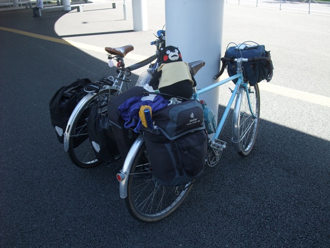 ネシ君はフェリーで門司入りして、湯布院やらやまなみハイウェイやら越えて、阿蘇を走ってから熊本入りのルート。ネシ君も台風をやり過ごすために熊本へ。台風のお蔭(?)で予定変更となり、たまたま熊本市で落ち合えることになったのでした。相変わらず美しいTOEIの水色ランドナーでございます。