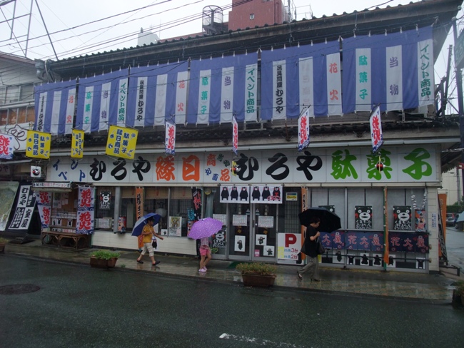 ちょいと入るのに勇気がいりましたが、二人いればなんとかなるでしょう。入ってみると一角にくまモンのお面などグッズの陳列があり、それ以外は和傘など、ある意味地味なものが少し置いてあるだけです…。外観からすると中はかなり広いイメージだったのでちょっと拍子抜けします。くまモングッズも人形が50個入りとか30個入りとか業者が買って行くような商品が多いです。まあ、でもせっかくなのでくまモングッズをいくつか買って行こうと棚を眺めていると…ご主人とおぼしき人が