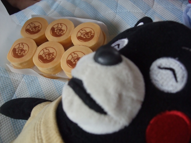 おやつに買ってきた「いちょう小町」。県民百貨店で売ってる饅頭です。くまモン印!