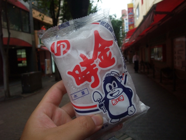 袋氷を入手し、ガリガリ食べながらブラブラ歩きます。この金時味、僕ン中で大ヒットです。いわゆる「みぞれ」味のシロップに豆が入ってるんです。これで60円ですからね。安いっすな。