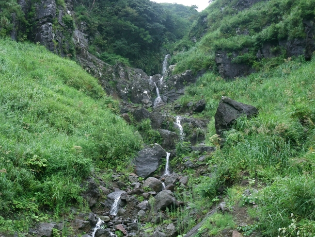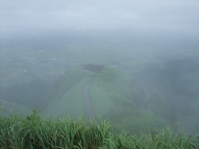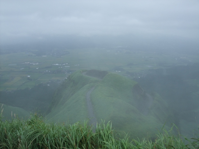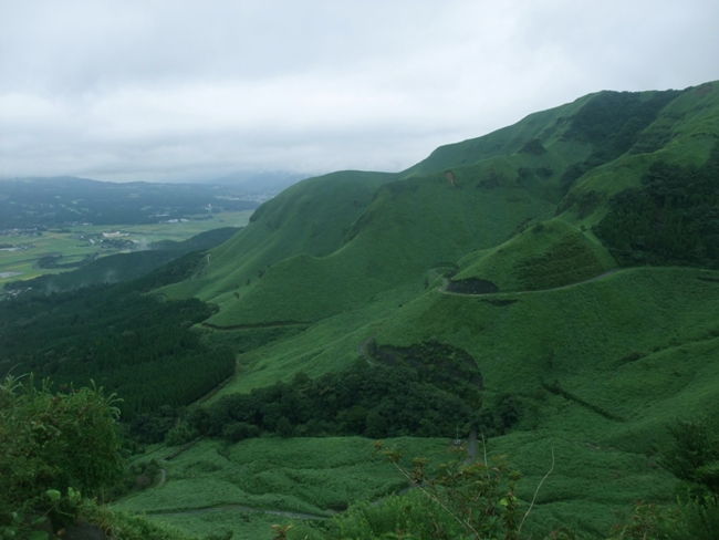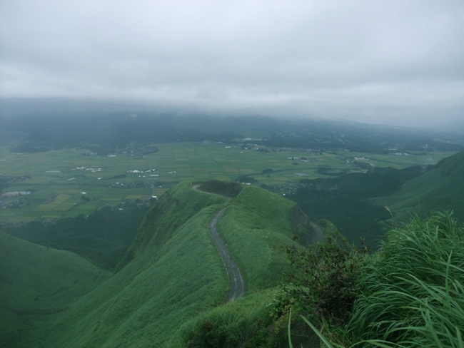 登ってきた道を眺められるポイント。野焼きされ草に覆われた急傾斜の山に沿って、道が削り取られています。自然と人工の融合って感じです。雨に濡れた緑は、より青々とした印象を与えてくれます。