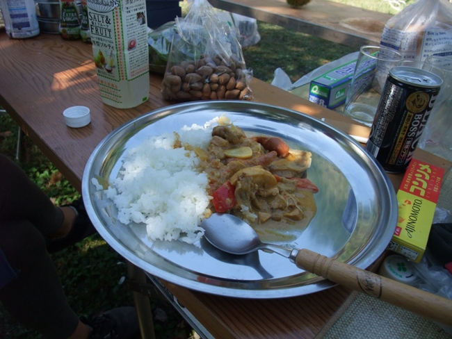 お昼ご飯は、事前に予約されてた月うさぎランチ組は、月うさぎさんのランチを。僕ら自炊組にはショコラさんがタイカレーを作ってくださいました。いなばのタイカレーイエローに色んな具材を入れたものです(*^^*)これがかなりの絶品!!昨晩の残り物の燻製なんかも入ってるんですが、バツグンに合います!!