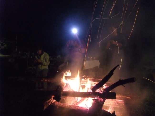 この晩もなかなか寒く、たき火で暖を取ります。しかし完全に食べすぎと飲み過ぎで早くに寝てしまいました・・・。トイレに起きると、もうすでにみんな寝静まっています。たき火の火もなくなり辺りは真っ暗です。