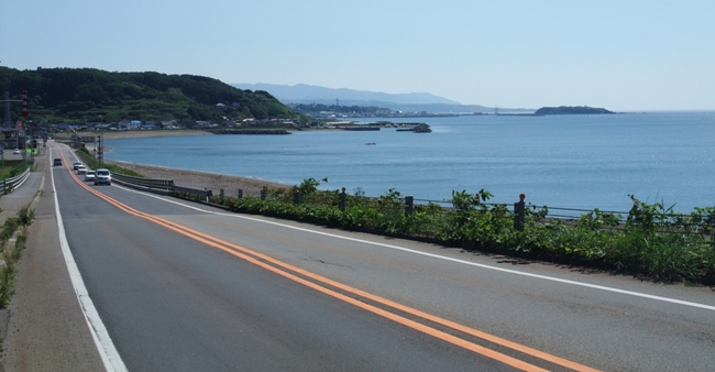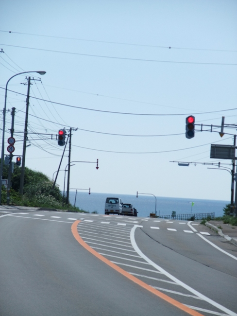 海にぶつかったら左に曲がり、南方向に海岸線に沿って走っていきます。すぐ先に江差の町とカモメ島が見えてきました。