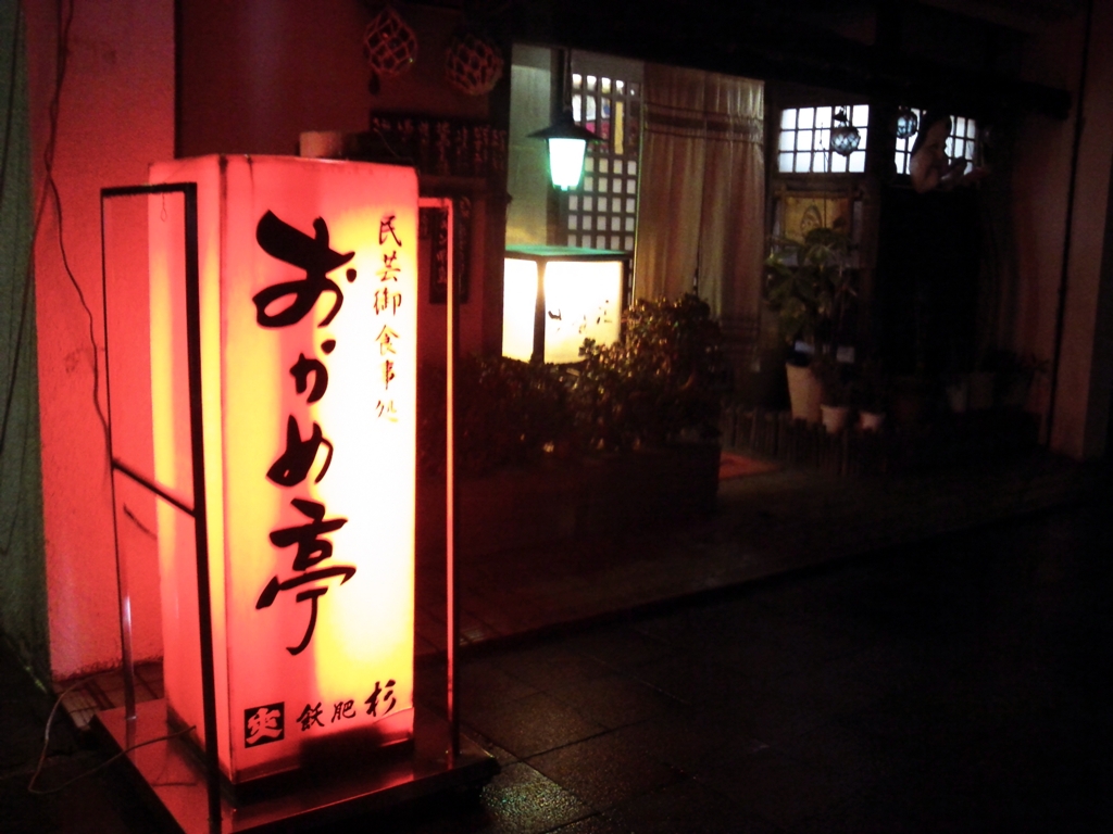 もう暗くなった油津の町なかを傘をさしながら歩いてみて、油津の駅前、赤い灯篭が目印の居酒屋「おかめ亭」さんへ。