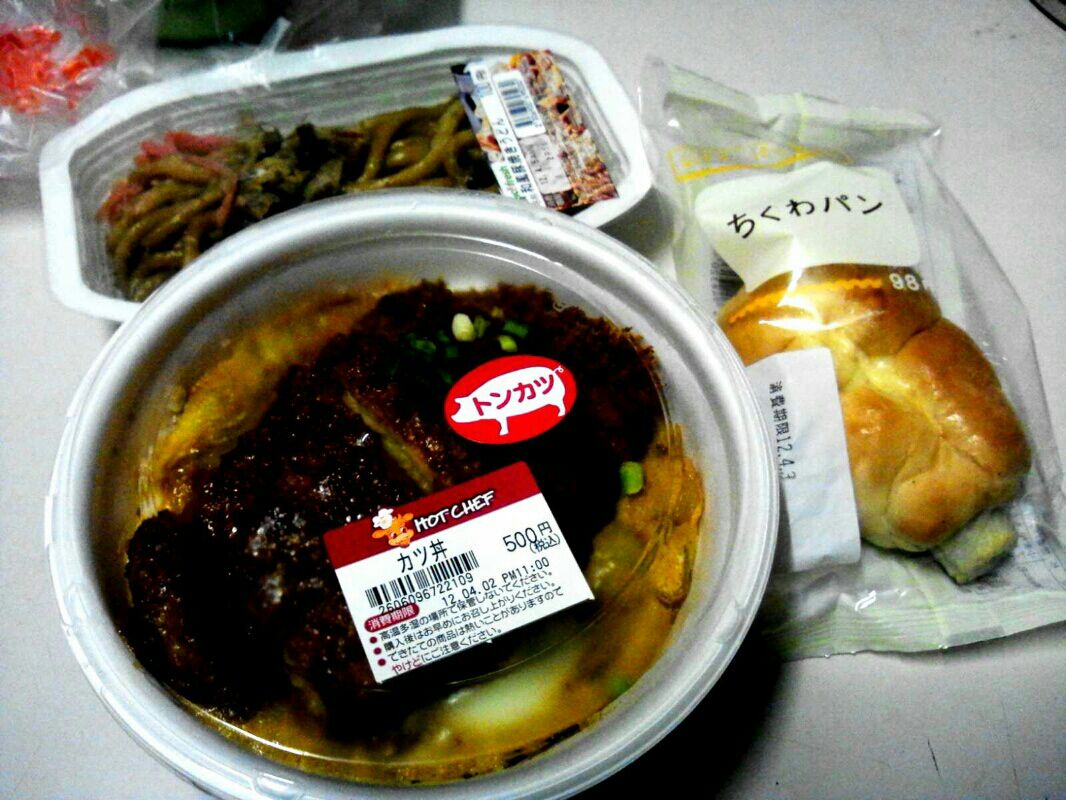 セイコーマート晩飯です。ホットシェフのカツ丼!100円焼きうどん。ちくわパン。